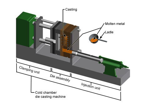 Die casting is a manufacturing process that can produce geometrically complex metal parts through the use of reusable molds, called dies. The die casting process involves the use of a furnace, metal, die casting machine, and die. The metal, typically a non-ferrous alloy such as aluminum or zinc, is melted in the furnace and then injected into the dies in the die casting machine. There are two main types of die casting machines - hot chamber machines (used for alloys with low melting temperatures, such as zinc) and cold chamber machines (used for alloys with high melting temperatures, such as aluminum). The differences between these machines will be detailed in the sections on equipment and tooling. However, in both machines, after the molten metal is injected into the dies, it rapidly cools and solidifies into the final part, called the casting.