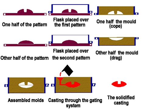 Sand casting, also known as sand molded casting, is a metal casting process characterized by using sand as the mold material. The term "sand casting" can also refer to an object produced via the sand casting process. Sand castings are produced in specialized factories called foundries. Over 60% of all metal castings are produced via sand casting process.